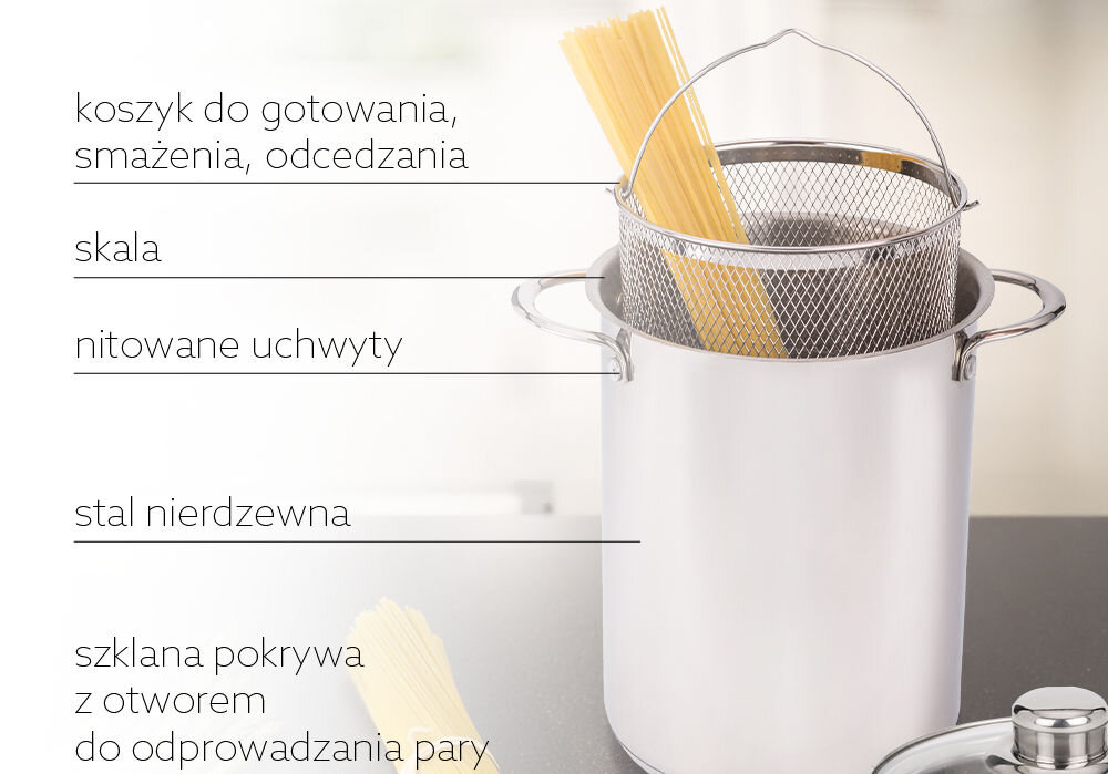 MGK-09 to garnek, który wyróżnia się funkcjonalnością dzięki praktycznemu koszykowi. Zaprojektowany z myślą o przygotowywaniu potraw takich jak szparagi, makaron czy frytki, oferuje wygodę i łatwość w gotowaniu. Koszyk umożliwia szybkie i precyzyjne gotowanie, a jego konstrukcja sprawia, że garnek jest wszechstronny. To połączenie efektywności i stylowego designu, które odmieni Twoje codzienne gotowanie.