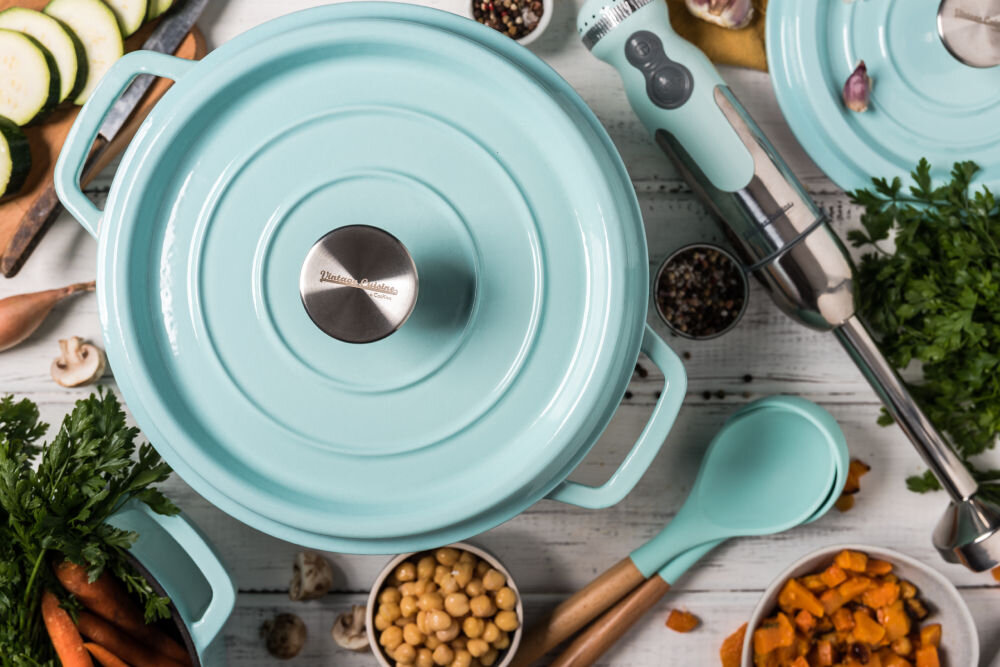 Garnek dostępny jest w 4 oryginalnych wersjach kolorystycznych: kremowej, miętowej, czarnej i czerwonej, które idealnie komponują się z pozostałymi akcesoriami i urządzeniami z linii Vintage Cuisine.