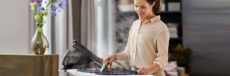 Nie trać czasu na rozkładanie deski do prasowania. Teraz wyprasowanie firanek, zasłon czy delikatnych sukienek z aplikacjami będzie wygodniejsze niż kiedykolwiek wcześniej! To naprawdę proste z super lekkim 800-gramowym żelazkiem PerfectCare o silnym wyrzucie pary.