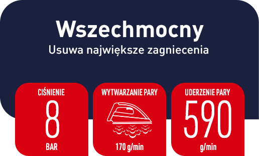 | Funkcje dodatkowe: | Gotowość do pracy po 2 minutach, Możliwość użycia wody kranowej, Prasowanie w pionie, Precyzyjny wyrzut z czubka żelazka, Schowek na przewód, Wyjmowany pojemnik na wodę |