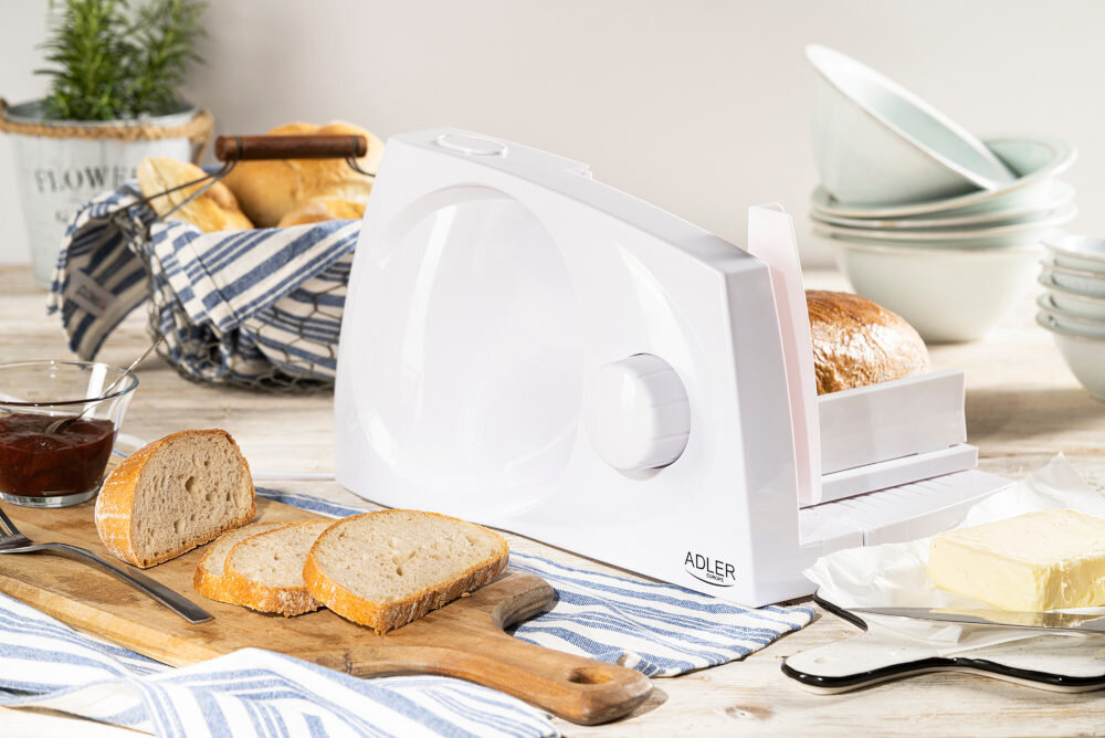 Kompaktowa, bezpieczna, łatwa do złożenia - taka właśnie jest krajalnica ADLER AD 4703. Mocne tworzywo sztuczne, z którego została wykonana, ułatwia transport.