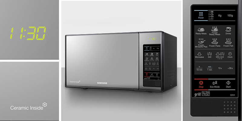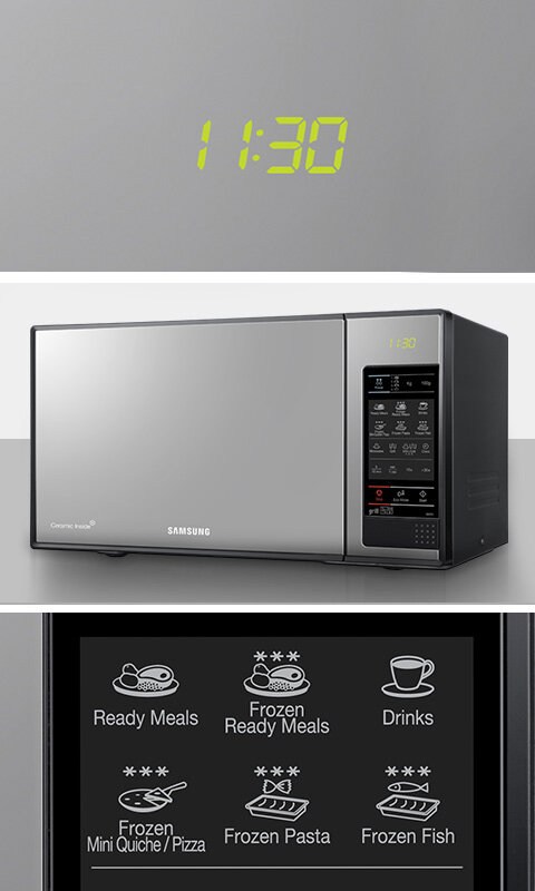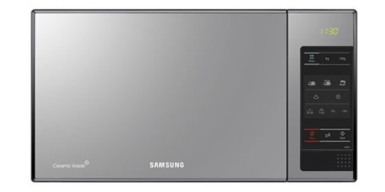 Lustrzany design kuchenki Samsung dopełnia wkomponowany wyświetlacz LED. Panel sterowania jest dotykowy z opisem poszczególnych przycisków co zapewnia prostą i intuicyjną obsługę. Co więcej, ekran urządzenia śledzi ruchy palca przez co sterowanie jest jeszcze łatwiejsze i wygodniejsze.