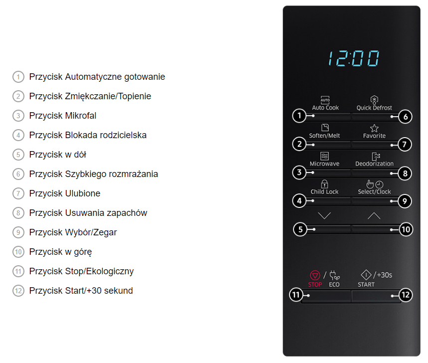 * Funkcja wydłuża czas pracy mikrofali o 30 sekund. ** Usuwanie nieprzyjemnych zapachów z komory kuchenki mikrofalowej.