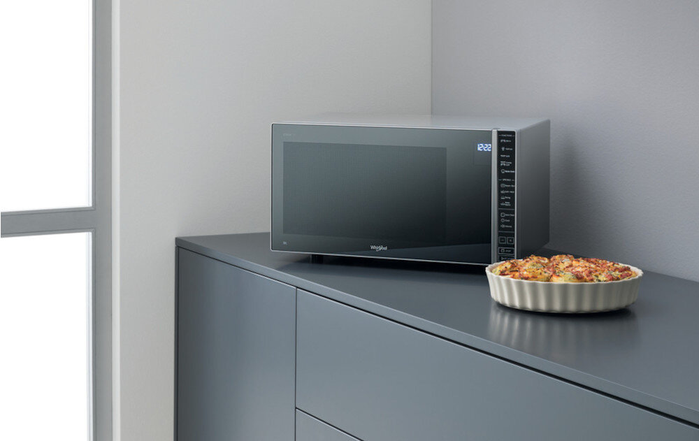 - Kuchenka mikrofalowa WHIRLPOOL MWP 304 M 900W średnica 31.5 cm pojemność 30L Jet Start Auto Cook DoughRising Lustrzane srebro