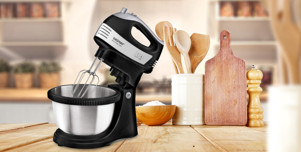 Mikser ZELMER ZHM2459BS, końcówka do mieszania i ubijania, 2 haki do zagniatania ciasta, stojak, misa, dokumentacja.