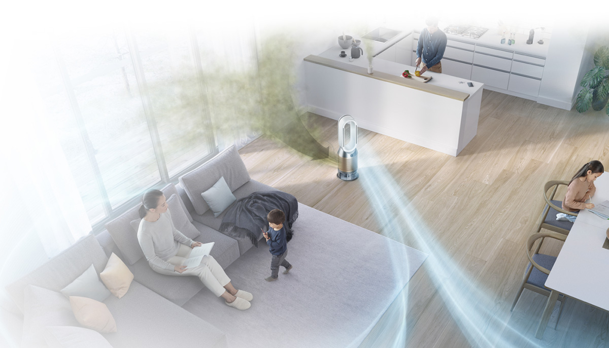 Technologia Dyson Air Multiplier™ rozprowadza oczyszczone i nawilżone powietrze w całym pomieszczeniu.
