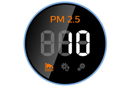 Oczyszczacz wskazuje aktualne stężęnie cząsteczek PM2,5 w powietrzu w g/m3.