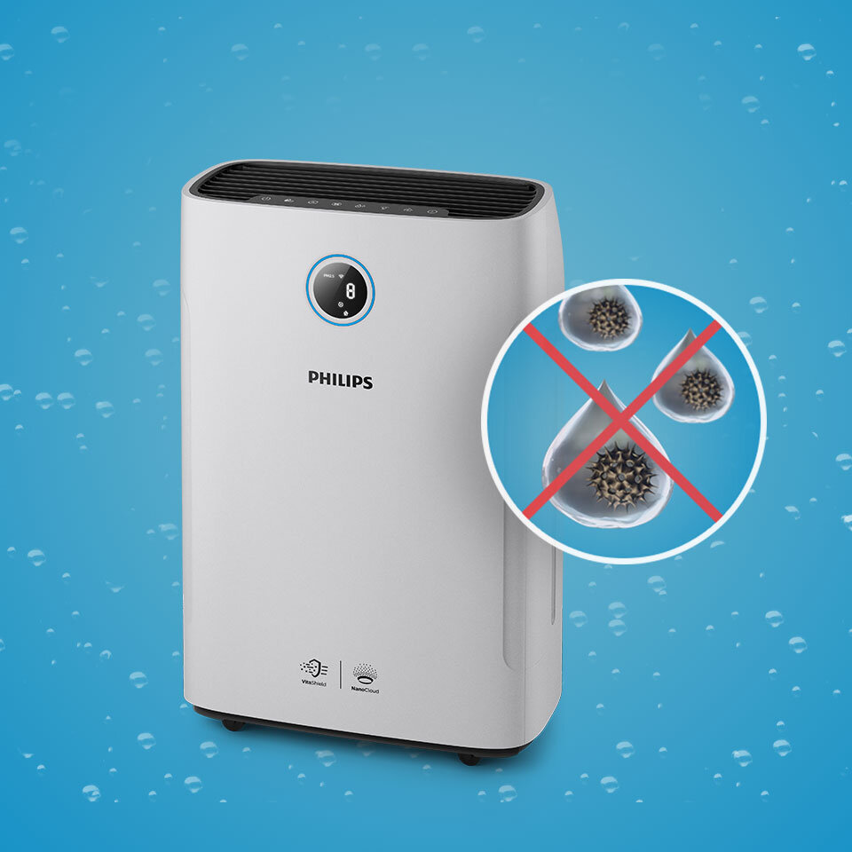 Technologia NanoCloud nawilża powietrze, wykorzystując naturalny proces parowania. Lekka mgiełka jest tworzona przez cząsteczki wody mikroskopijnej wielkości. Ich niewielkie rozmiary utrudniają drobnoustrojom przenoszenie się w powietrzu. Dzięki temu Oczyszczacz 2w1 zapewnia o 99% mniej bakterii*, a Ty możesz się cieszyć nawilżonym, zdrowym powietrzem.