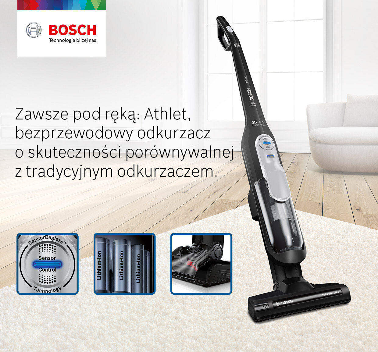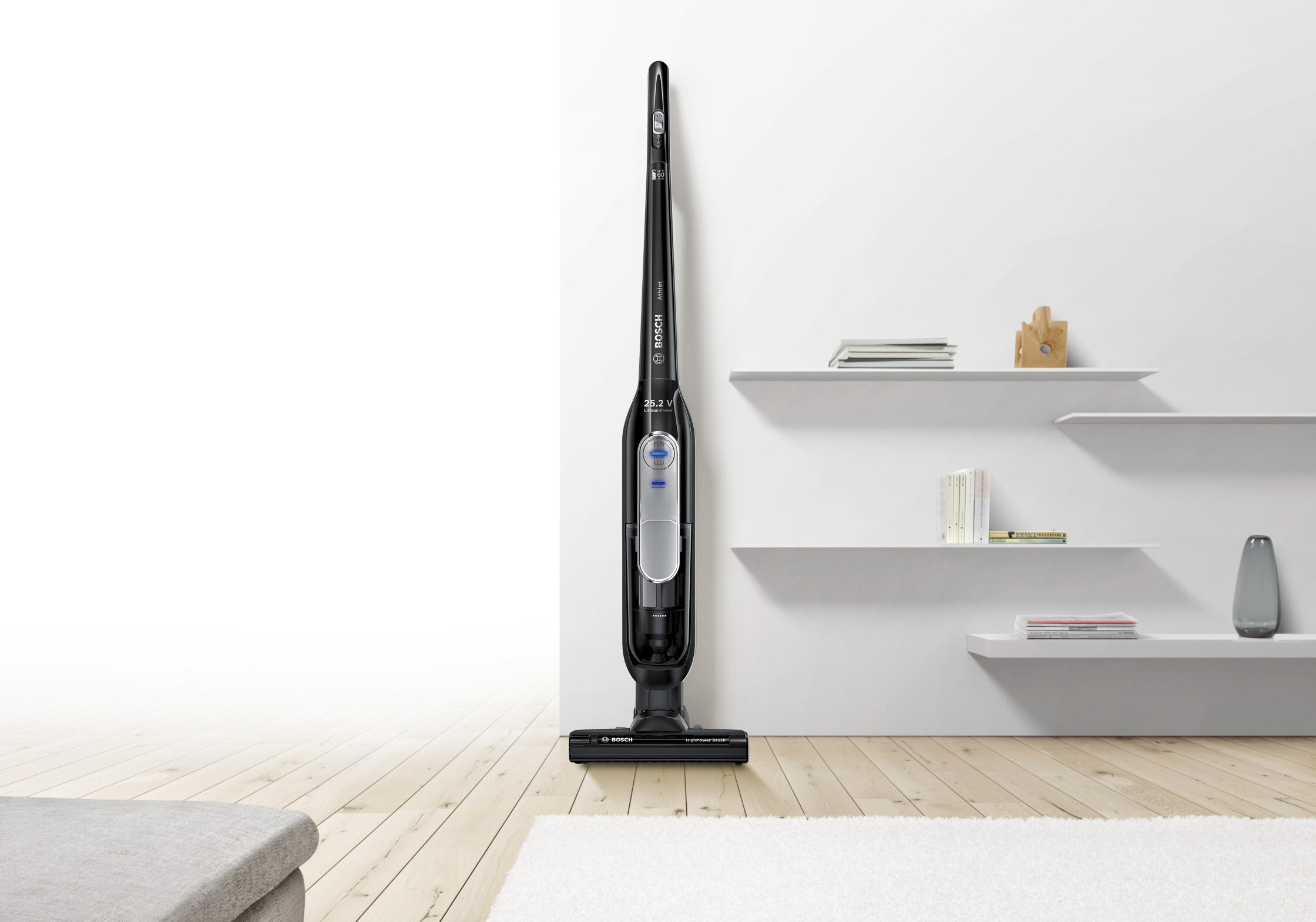 Athlet kompletnie zmienia zasady bezprzewodowego odkurzania. Dzięki nowoczesnej, eleganckiej konstrukcji i zastosowaniu wysokiej jakości materiałów, Athlet marki Bosch może być z powodzeniem eksponowany w każdym miejscu domu.