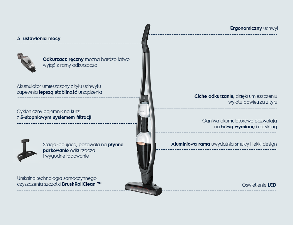 Pionowa konstrukcja urządzenia ułatwia też odkurzanie bez konieczności schylania się, a dzięki nowoczesnemu wzornictwu może stać w pokoju czy kuchni będąc zawsze pod ręką gotowy do pracy.