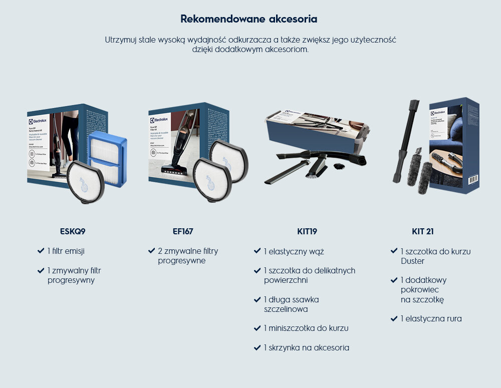 Pure Q9 gwarantuje nie tylko czyste podłogi. Do odkurza dołączone są dodatkowe akcesoria ułatwiające odkurzanie trudno dostępnych miejsc. W zestawie z odkurzaczem: