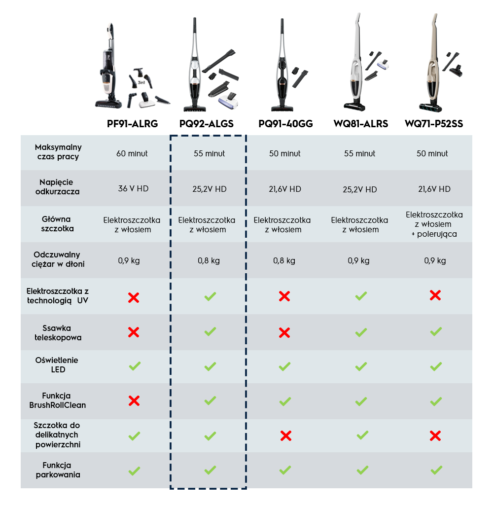 | Funkcje dodatkowe: | Konstrukcja typu 2w1, Oświetlanie odkurzanego miejsca, Samostojąca konstrukcja, Technologia BrushRollClean... |