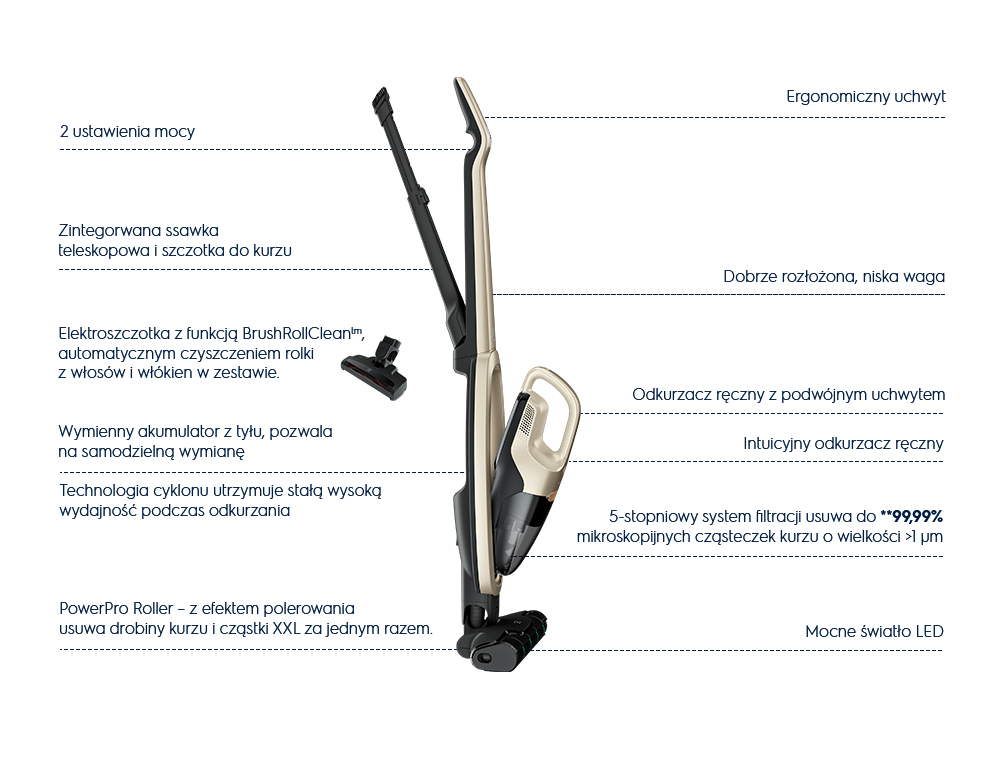 Funkcje: | Elektroszczotka, Podświetlana szczotka, Odłączany odkurzacz ręczny, Regulacja mocy ssania, Dla alergików, Dla posiadaczy zwierząt |