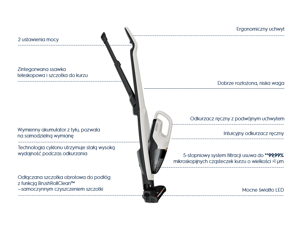 *utrzymuje 99% początkowej wydajności odkurzania w miarę zapełniania pojemnika zgodnie z IEC 62885-2 wyd.