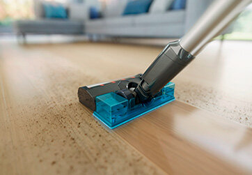Wystarczy jedno kliknięcie, aby podłączyć do odkurzacza moduł Aqua, który pomoże usunąć drobny kurz i pozbyć się bakterii z podłóg twardych.
