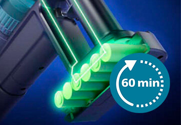 Pozwala sprzątać nieprzerwanie przez 60 minut pracy w trybie normalnym2 i 15 minut pracy z najwyższą mocą3.