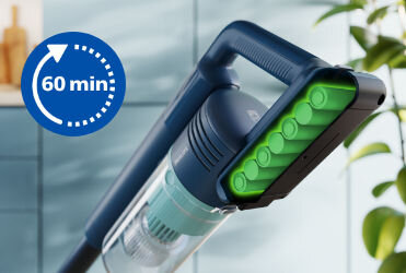 Sprzątanie całego domu za jednym razem dzięki akumulatorowi zapewniającemu do 60 minut1 pracy w trybie eco lub 15 minut2 w trybie turbo.