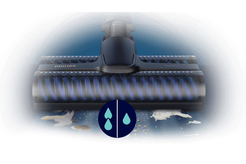 Unikatowa i opatentowana nasadka z technologią AquaSpin, dzięki zastosowaniu dwóch szybkorotujących szczotek skutecznie odkurza i jednocześnie aktywnie myje twarde podłogi.