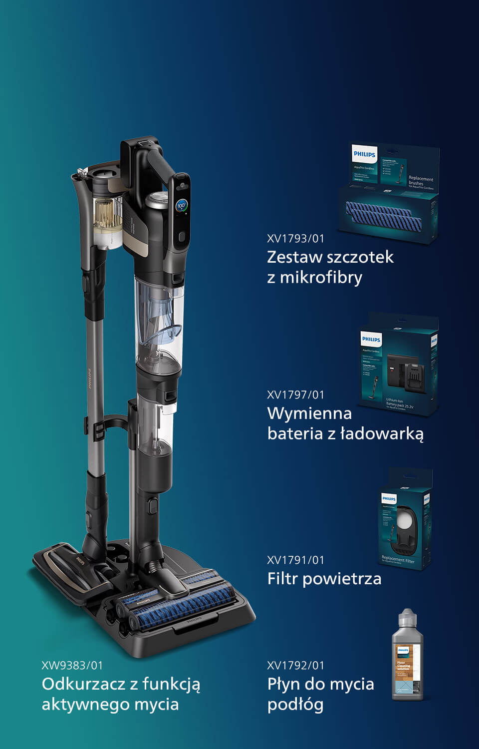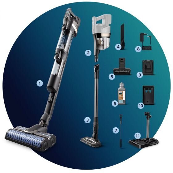 | Konstrukcja: | Ergonomiczny uchwyt, Konstrukcja 3w1, Parkowanie w pionie, Płaska konstrukcja szczotki, Podświetlenie LED na nasadce, Stacja ładująca z funkcją organizera na akcesoria, Wskaźnik LED, Wyjmowany akumulator, Wyjmowany pojemnik, Zbiornik na czystą wodę i zbiornik na brudną wodę |