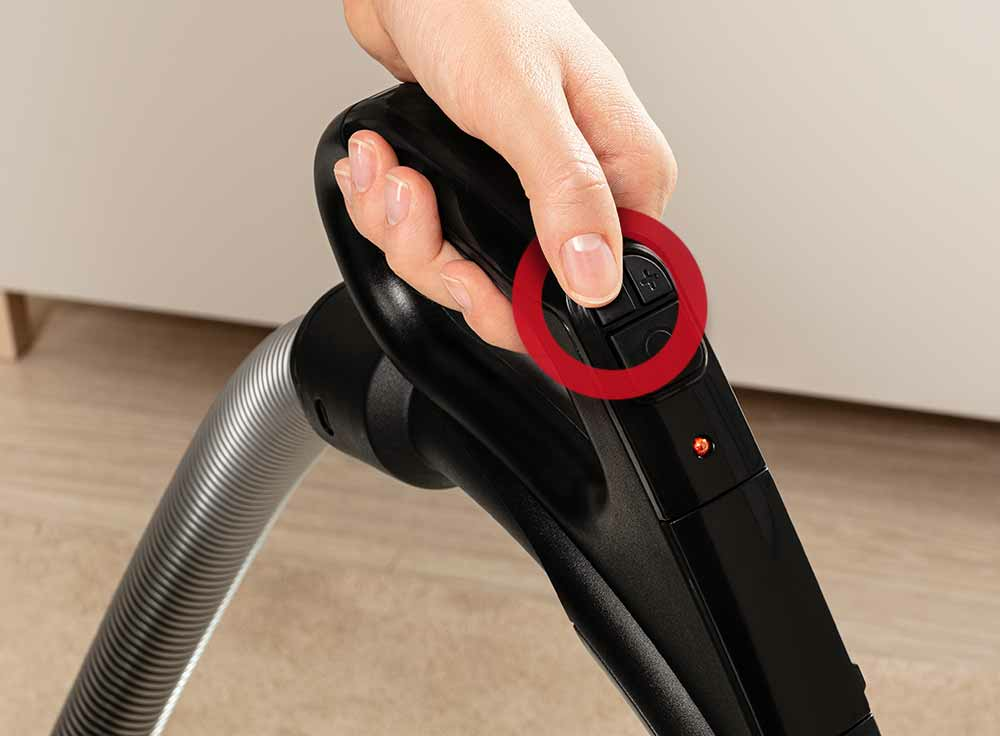 Przyciski znajdujące się w uchwycie pozwalają na komfortowe włączanie, wyłączanie i regulowanie mocy odkurzacza.