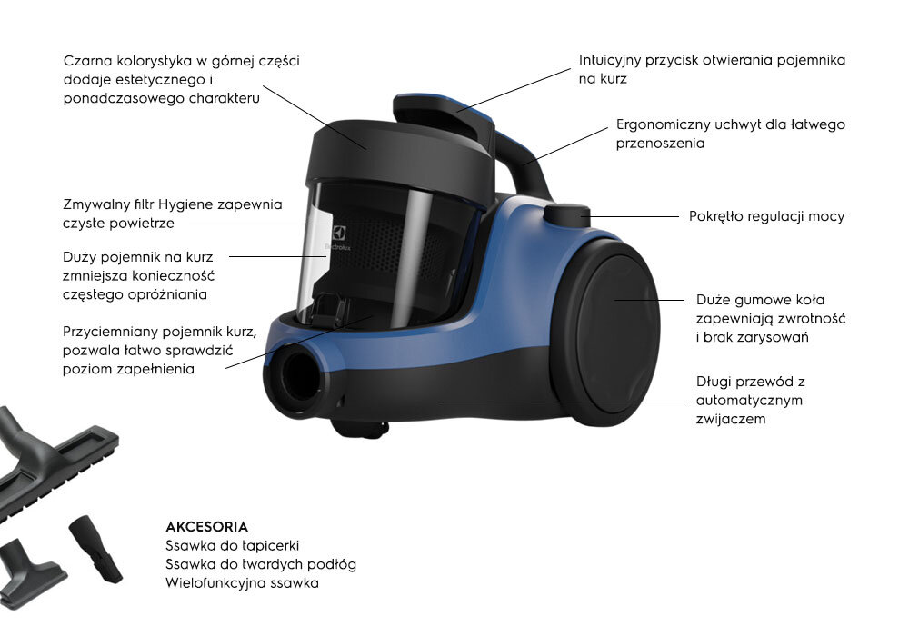 | Funkcje: | Regulacja mocy ssania, Zwijacz przewodu |