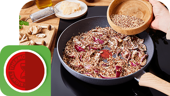 Skorzystaj ze wskaźnika Thermo-Signal™ umieszczonego na dnie patelni, który poinformuje Cię, kiedy patelnia osiągnie temperaturę idealną do rozpoczęcia smażenia. Symbol klepsydry zniknie, zmieniając się na intensywnie czerwony, dając Ci znak na rozpoczęcie przygotowywania posiłku. Dzięki temu Twoje potrawy będą zawsze perfekcyjnie przyrządzone.