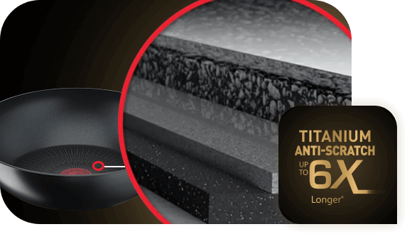Z Wokiem Tefal Excellence odkryjesz jeszcze bardziej wytrzymałą, nieprzywierającą powłokę Titanium Anti-Sratch o maksymalnej odporności na zarysowania. Nowa technologia sprawia, że jest ona do 6x bardziej trwała niż standardowa powłoka Titanium, dzięki czemu sprawdzi się przez długie lata!