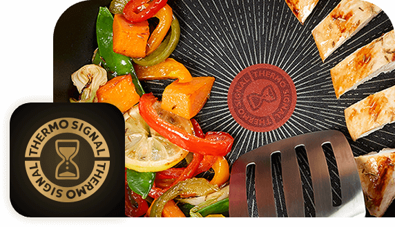 Skorzystaj ze wskaźnika Thermo-Signal™ umieszczonego na dnie woka, który poinformuje Cię kiedy wok osiągnie temperaturę idealną do rozpoczęcia smażenia. Symbol klepsydry zniknie, zmieniając się na intensywnie czerwony, dając Ci znak na rozpoczęcie przygotowywania posiłku. Dzięki temu Twoje potrawy będą zawsze wspaniale przyrządzone.