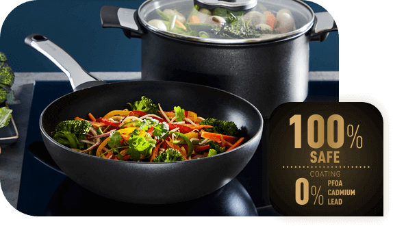 Powłoka woka została wykonana z całkowicie bezpiecznych składników, nie zawiera PFOA, jak również szkodliwego kadmu i ołowiu, dzięki czemu ma najwyższą gwarancję bezpieczeństwa w użytkowaniu. Wok Tefal Excellence został wyprodukowany w ekologicznym procesie produkcji i nadaje się do recyklingu.