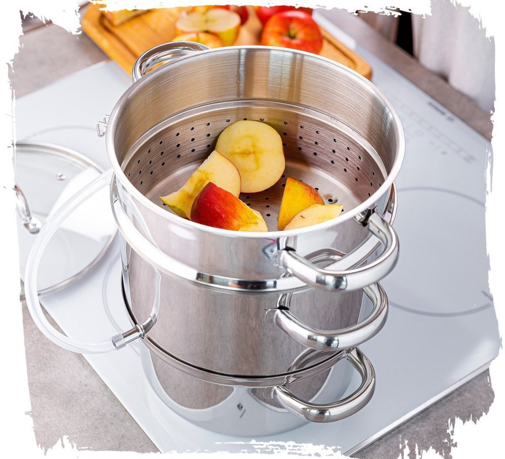 Sokownik wykonany został z najwyższej jakości stali nierdzewnej 18/10, co gwarantuje bezpieczeństwo w kontakcie z żywnością oraz trwałość produktu, odpornego na uszkodzenia i wysokie temperatury. Dzięki wielowarstwowemu dnu, garnek nagrzewa się równomiernie na każdym poziomie, przyspieszając proces przygotowywania soku i skracając czas gotowania. To skuteczne oszczędzanie energii, które odbije się pozytywnie na Twoich rachunkach za prąd. Przygotowanie soku z owoców miękkich zajmuje zaledwie 30 minut. Natomiast przygotowanie soku z owoców twardych trwa maksymalnie do 60 minut. Wykorzystaj miąższ pozostały po wytłoczeniu soku do przygotowywania smacznych dżemów.