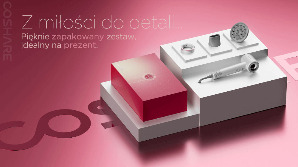 Suszarka COSHARE SuperFlow1 Pro, magnetyczny pierścień EssenceRing, koncentrator montowany magnetycznie, dyfuzor montowany magnetycznie, dokumentacja.