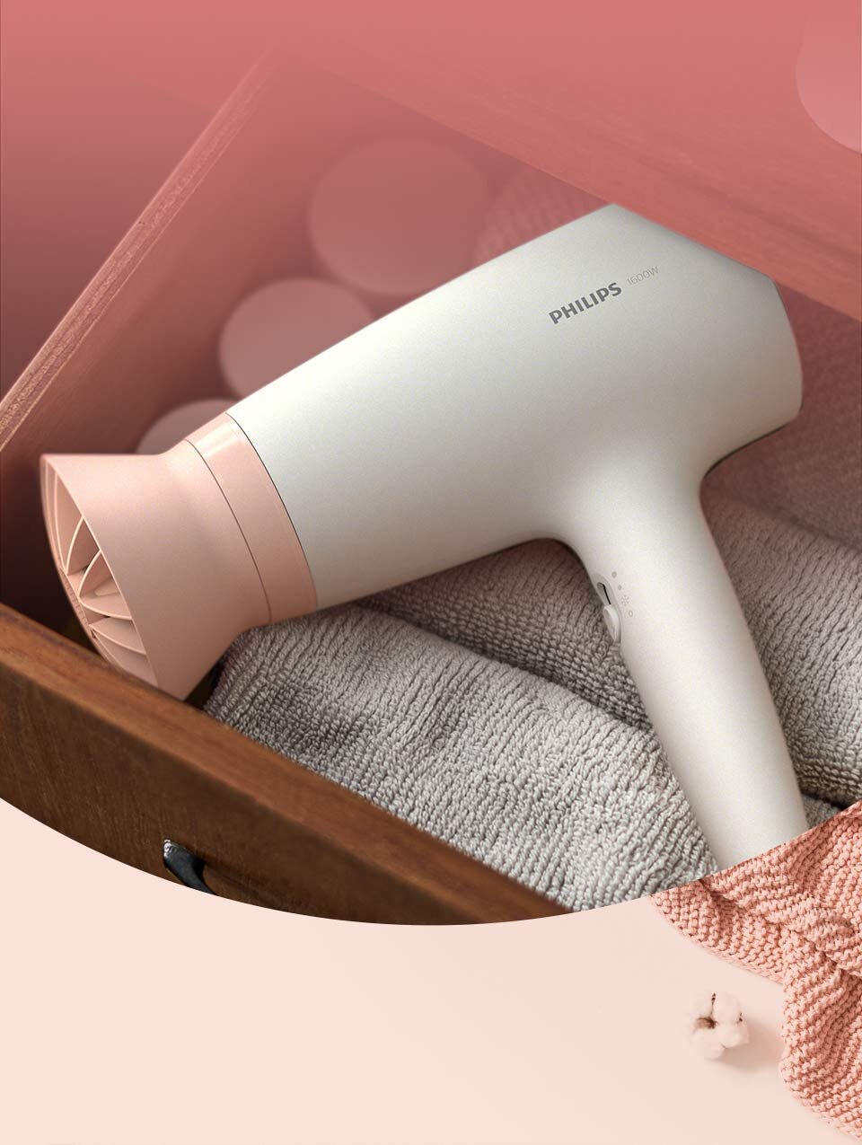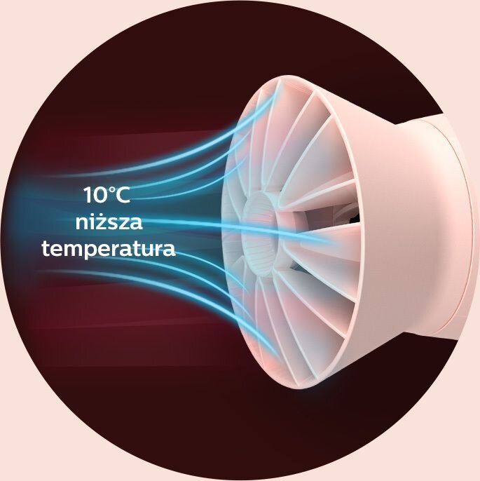 Suszarka Philips o mocy 1600 W i silnym nadmuchu powietrza zapewnia szybkie i dokładne suszenie.