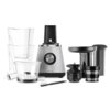 W zestawie znajduje się: pojemnik na miąższ 0,8 l, pojemnik na sok 0,8 l, szczoteczka do czyszczenia, filtr oraz tłoczek.