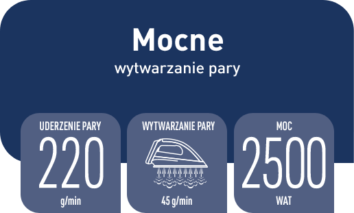 Przyśpiesz efekty prasowania, dzięki mocnemu wyrzutowi pary o mocy 220 g/min, który wniknie w głąb materiału i od ręki usunie najtrudniejsze zagniecenia. Możesz prasować szybko i jeszcze wydajniej dzięki stałemu wyrzutowi pary aż 45 g/min.