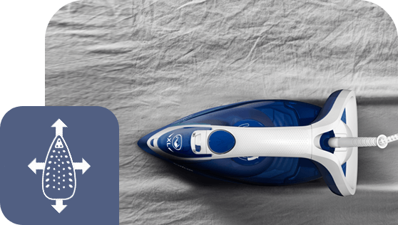 Żelazko dokładnie rozprowadza parę we wszystkich otworach: na czubku, po bokach oraz po środku stopy. Dzięki temu prasowanie jest wyjątkowo skuteczne.