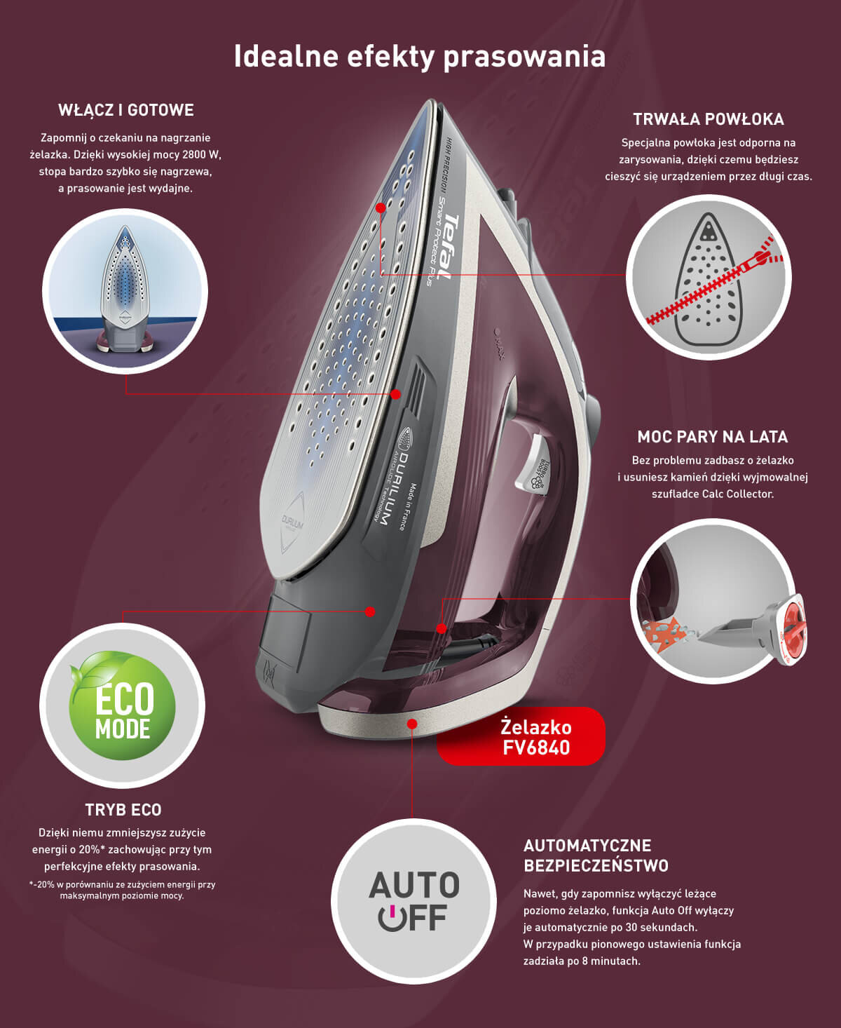 Powłoka stopy Durilium AirGlide sprawi, że żelazko z łatwością ślizga się po tkaninie. Prowadzenie żelazka jest łatwe i przyjemne, wydobycie pary optymalne, a Ty pewność, że prasowanie pójdzie gładko.