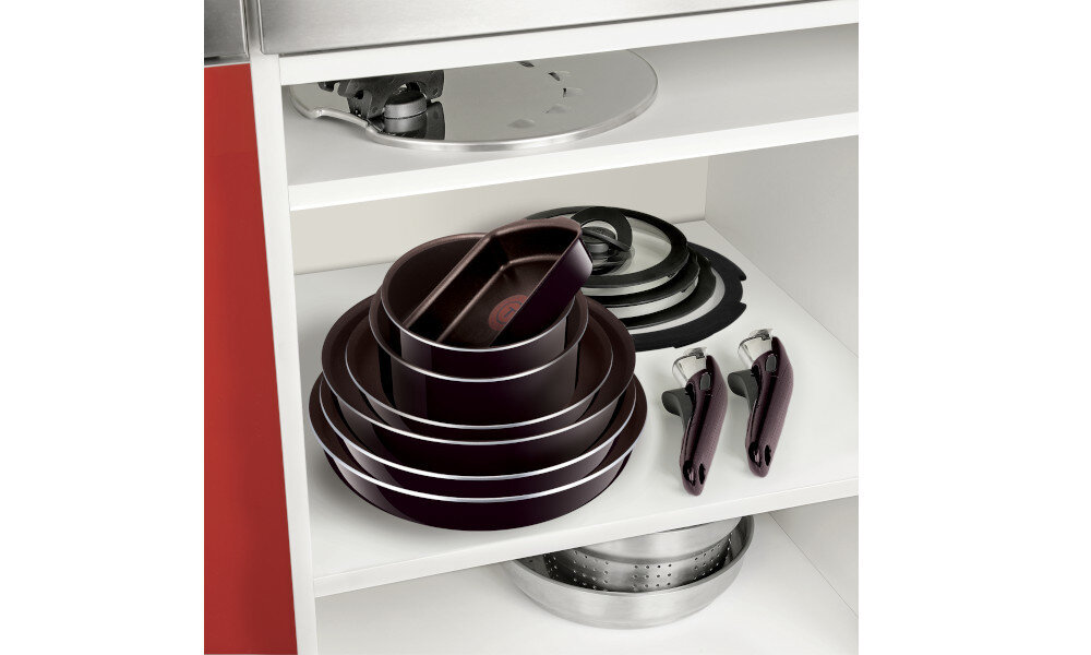 Możesz z łatwością przechowywać pokrywki Ingenio w swojej kuchni dzięki składanemu uchwytowi i płaskiemu kształtowi pokrywki.