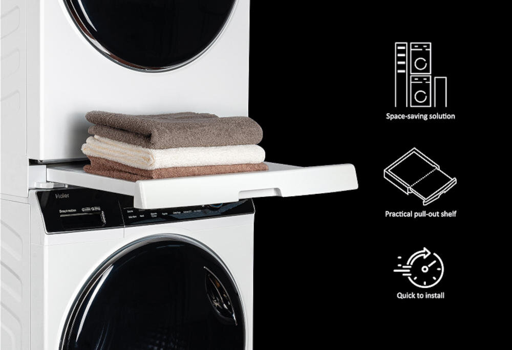 Poznaj łącznik HAIER Stacking Kit. Jest to nowoczesne rozwiązanie do Twojej pralni lub łazienki, dzięki któremu zyskasz więcej miejsca do przechowywania. Łącznik pozwoli Ci ustawić sprzęty w jednej, stabilnej i bezpiecznej wieży.