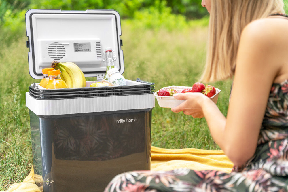 Zabierz ją na piknik lub w podróż. Zimą lub latem. Oto lodówka turystyczna MILLA HOME MTC600G o solidnej pojemności 24 l, która pomieści sporo żywności i napojów. Urządzenie nie tylko schłodzi produkty do 15 stopni poniżej temperatury otoczenia, ale także – jeśli zechcesz – utrzyma temperaturę lub nawet podgrzeje ciepłe posiłki do 55˚C.