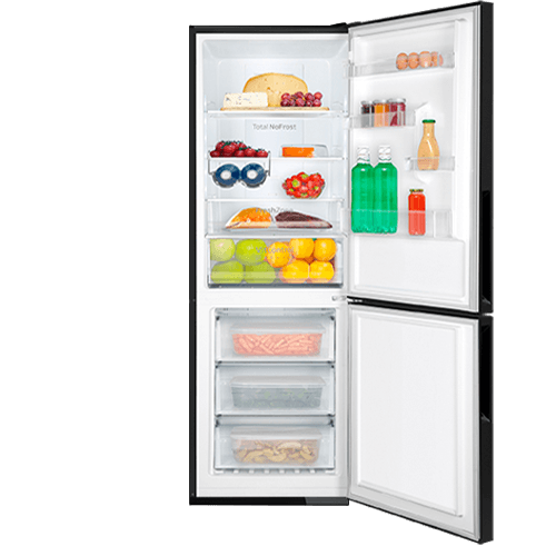 Technologia Total NoFrost zapewnia stałą kontrolę poziomu wilgotności zarówno w chłodziarce, jak i zamrażarce, co oznacza brak szronu w środku i brak potrzeby rozmrażania!