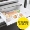 Szuflada My Zone pozwala na błyskawiczne dopasowanie temperatury, zapewniając odpowiednie warunki dla różnych produktów spożywczych. Dzięki trzem trybom: Strefa Fresh (od 0°C do 1°C), Szybkie Schładzanie (od 2°C do 3°C) oraz Owoce i Warzywa (od 4°C do 5°C), możesz precyzyjnie regulować temperaturę, dostosowując ją do przechowywania mięsa, serów, owoców i warzyw, a także produktów do rozmrażania, owoców morza czy artykułów wymagających szybkiego schłodzenia.