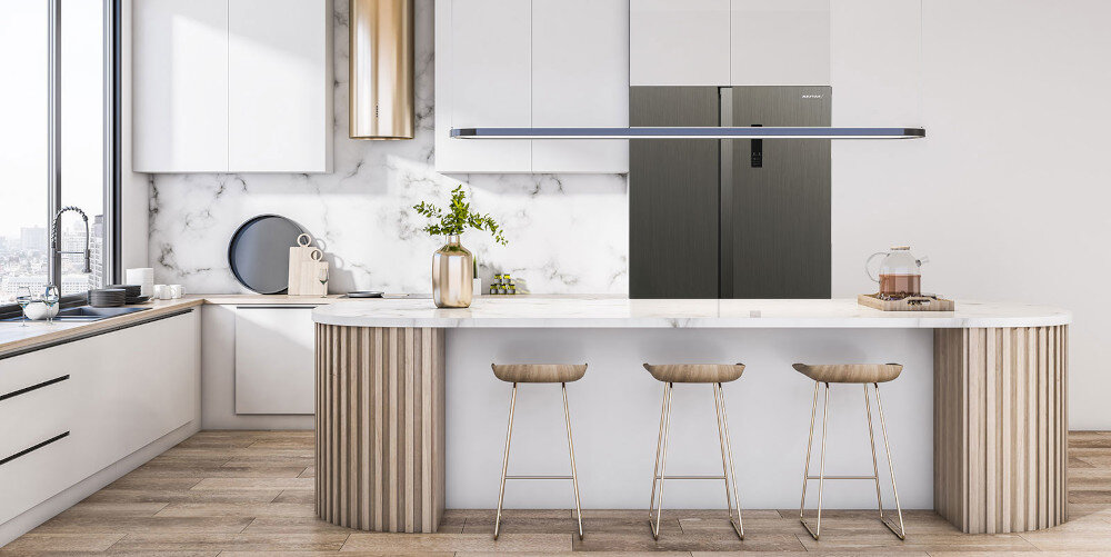 Lodówka Side-by-Side przyciąga uwagę bardzo eleganckim i oryginalnym designem. Kolor inox idealnie pasuje do każdego wystroju wnętrza.