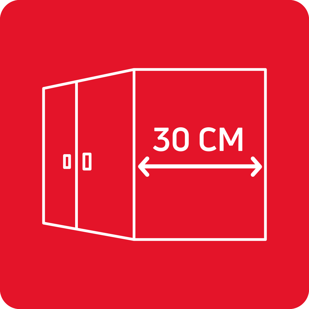 Zmniejszona głębokość konstrukcji okapu pozwala na bezproblemową instalację w standardowej, 30. centymetrowej szafce.