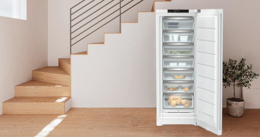 Pionowy, ergonomiczny uchwyt ułatwia wygodne otwieranie zamrażarki LIEBHERR FND 7227. Uchwyt jest zintegrowany z powierzchnią drzwi, co tworzy gładką, minimalistyczną estetykę bez wystających elementów. Taki design nie tylko podkreśla wygląd zamrażarki, ale także zwiększa bezpieczeństwo i wygodę użytkowania, ponieważ zmniejsza ryzyko zahaczenia o wystające części. Ergonomiczne umiejscowienie uchwytu ułatwia otwieranie drzwi, zapewniając komfort i płynność ruchu. Dzięki temu zamrażarka z wpuszczanym uchwytem idealnie wpasowuje się w każdą kuchnię, zachowując jednocześnie pełną funkcjonalność.