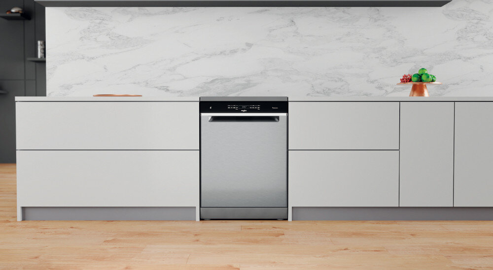 Zużycie 9,5 l wody do umycia aż 14 kompletów naczyń? To możliwe za sprawą technologii 6. Zmysł w zmywarce WHIRLPOOL WFO 3T133 PF X przy włączonym programie Eco.