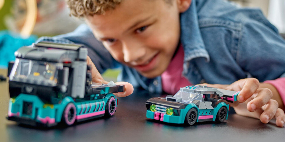 W zestawie znajdują się minifigurki kierowców ciężarówki i wyścigówki. Wymyślanie historii dla bohaterów podkręca wyobraźnię dziecka na znacznie wyższe obroty i uczy cennej zdolności wcielania się w role.