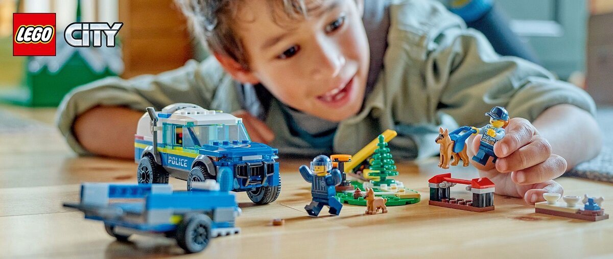 Dzieci i wielbiciele psów w wieku od pięciu lat pokochają zestaw LEGO® City Szkolenie psów policyjnych w terenie (60369). Obejmuje on SUV-a K9, przyczepę i trzy akcesoria do szkolenia psów, w tym równoważnię, płotek i stopnie. Wystarczy tylko dodać figurki policjantów i piesków, i można zaczynać zabawę. Model policyjnego SUV-a po złożeniu ma 7 cm wysokości, 14 cm długości i 6 cm szerokości. Zestaw składa się ze 197 elementów i jest przeznaczony dla dzieci powyżej 5 roku życia.