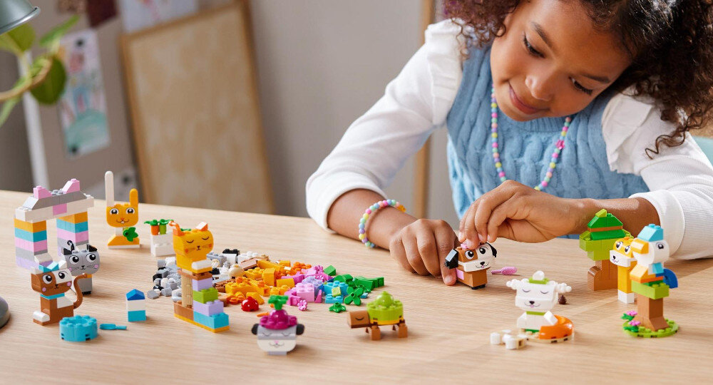 Dzieci mogą zbudować pieska z miską i kością, kotka na drapaku, chomika z jabłkiem, królika z marchewką i ptaka na grzędzie. Zabawki LEGO Classic są pełne pomysłów i inspiracji, dzięki czemu rodzice mogą uczestniczyć w zabawie i rozwoju dzieci na różnych etapach.