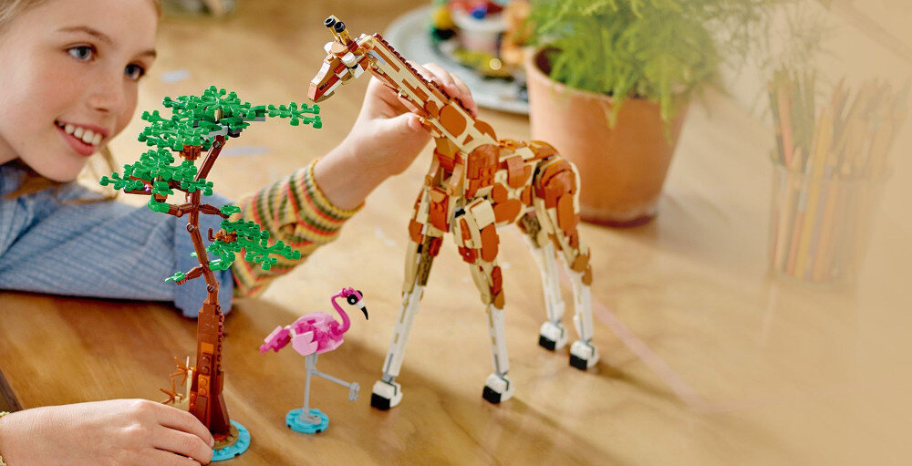 Budując zestaw konstrukcyjny LEGO® Creator Dzikie zwierzęta z safari (31150), dzieci mogą wziąć udział w niesamowitym safari. Twórczą zabawę gwarantuje im żyrafa z ruchomymi nogami, długą szyją, ogonem i uszami, stojąca obok małego drzewa i flaminga z klocków. Po skończonej zabawie można ustawić wszystkie modele na półce, by cieszyły oko.