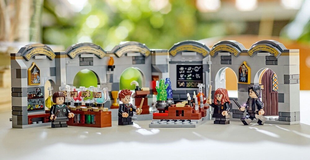 Dzięki temu czarodziejskiemu zestawowi LEGO Harry Potter (76431) dla dzieci w wieku od ośmiu lat młodzi czarodzieje, czarownice i mugole mogą teraz dołączyć do zajęć z eliksirów w zamku Hogwart. Zestaw zawiera klasę do zbudowania, którą można otworzyć, aby ułatwić zabawę. Jest ona pełna realistycznych detali: zawiera tablicę z instrukcjami przygotowywania eliksirów, fiolki ze składnikami eliksirów do mieszania w kociołku i inne akcesoria inspirujące do kreatywnej zabawy. Zestaw składa się z 397 elementów i jest przeznaczony dla dzieci powyżej 8 roku życia.